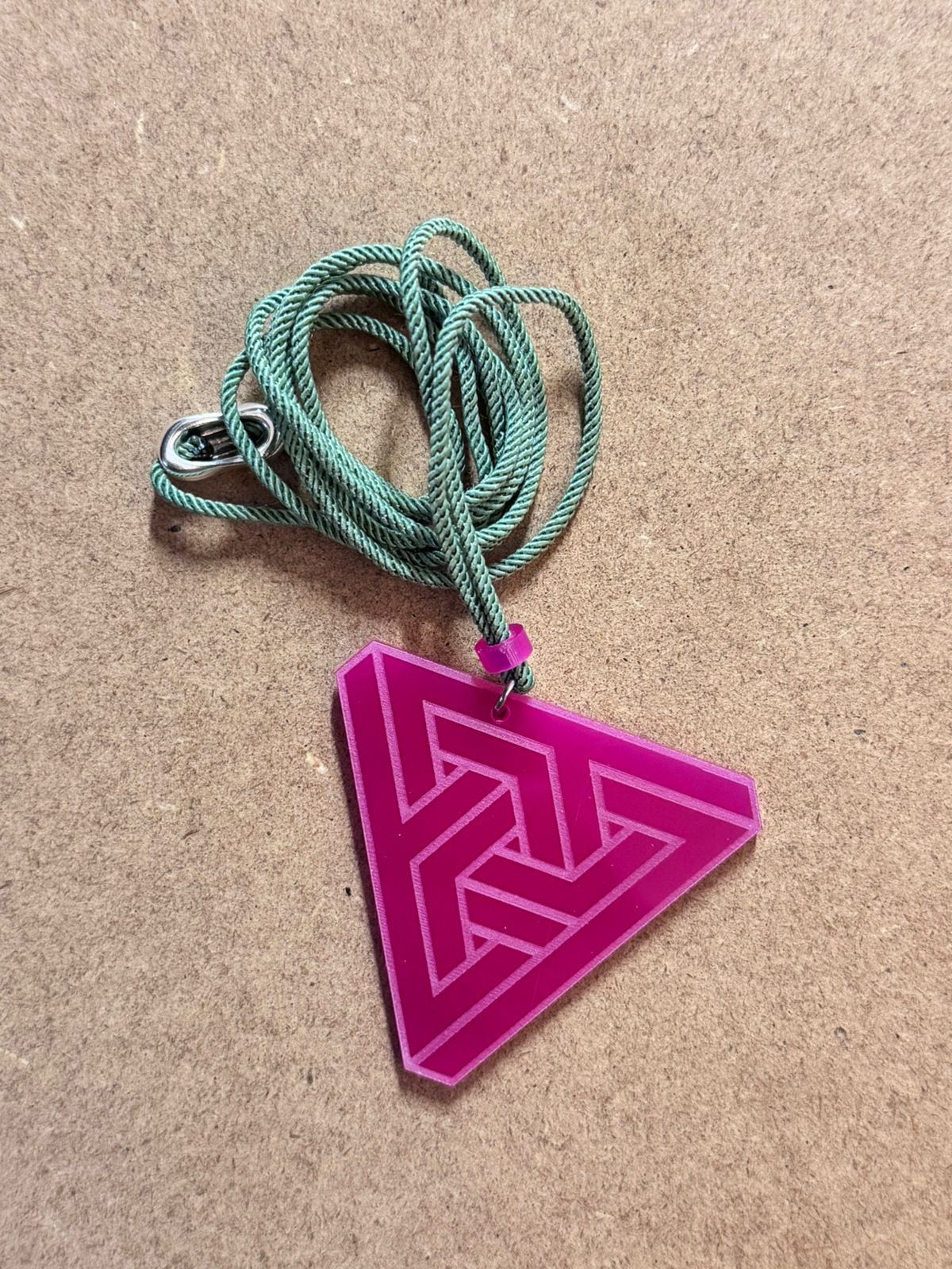 Make a bold statement with this Geometric Triangle Pendant Necklace, featuring a striking interwoven design laser-cut from high-quality acrylic. Perfect for lovers of modern, minimalist accessories, this lightweight pendant is paired with a fixed-length cord for everyday wear. The vibrant pink color adds a pop of brightness to any outfit, while the intricate geometric pattern highlights a sleek, contemporary style.